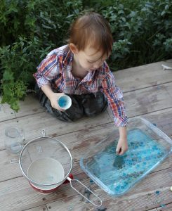 Je propose cette activité dehors sinon je me retrouve avec des petites billes partout dans le salon ^^