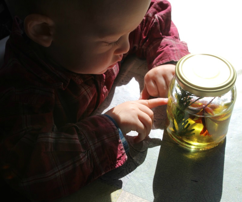 Dans un premier temps remplissez votre bocal d’un liquide, soit de l’eau, de l’huile, ou un peu des deux. Puis ajoutez du colorant (si vous le désirez) et tout plein de choses dedans feuilles, batons, paillettes etc… Fermez et admirez le résultat, secouez…