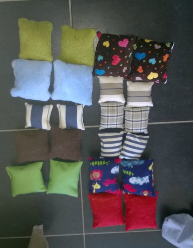 Puis après j’ai sorti les coussins sensoriels que ma maman m’a faits 🙂 ce sont des paires de coussins au même visuel et au même touché! Donc 2 activités sont possibles. Faire des paires avec les matières, coton, serviette, simili cuir, polaire, feutrine … Ou par même motif 🙂