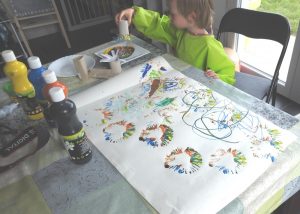 il suffit de tremper dans la peinture et de tamponner la feuille 🙂 Une activité qui a bien plu à Jérôme et qui a consciencieusement rempli la feuille 🙂