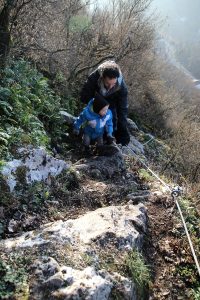 A un moment du parcours nous sommes arrivés à une montée bien raide! Si vous avez le vertige ou de très jeunes enfants en bas âge je ne vous le conseille pas vraiment! Heureusement mon mari a géré parfaitement ce chemin avec Pierre qui a 2 ans et demi et Jérôme s’est enthousiasmé de ce chemin escarpé, et a passé son temps à hurler « ouaiiiiiis trop chouette c’est génial » pendant que maman pestait et soufflait :p