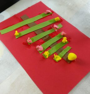 Collez en premier la bandelette marron dans le sens vertical, puis les bandelettes vertes de la plus grande à la plus petite, dans le sens horizontal et de bas en haut.